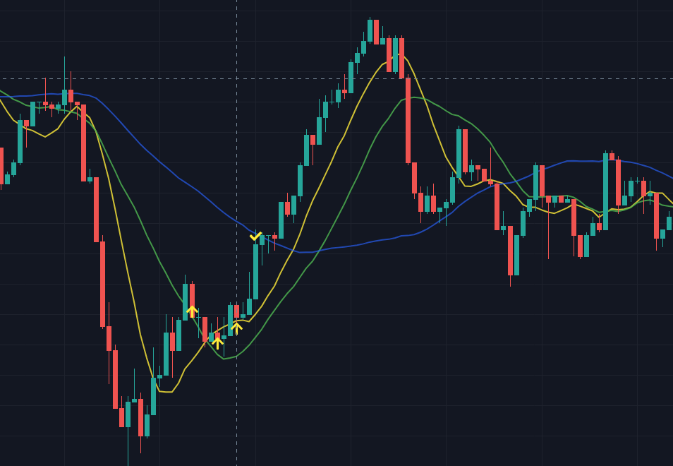 例えば、押し目買いをするとして、黄色矢印のように1ロットずつ3回に分けてエントリーし、黄色チェックマークで決済したとします。本当は3ロット一発で入りたかったけど、最初の矢印で買っていたら、少し逆行したときに損切りしてしまうこともあります。そこで3回に分けてエントリーするわけです。