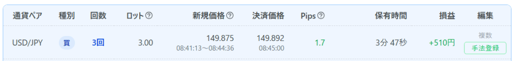 上記の例でいうと、3ロットで+1.7pipsのトレードとして手法を適用することが出来ます。これにより分割トレードに対しても期待値を測定しやすくなったと思います。