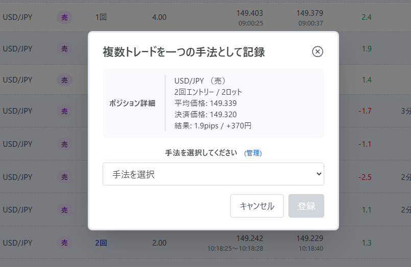しかしこれを手法として登録するには、以前は3つのうち、1つずつを手法として登録するしかありませんでした。今回のアプデではこれを解決すべく複数のトレードを1つのトレードとして登録することができるようにしました。