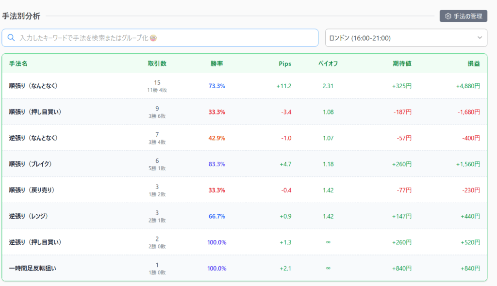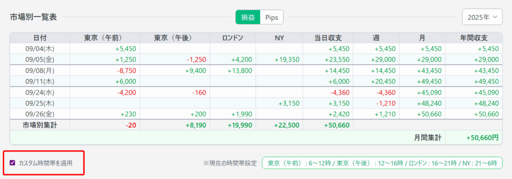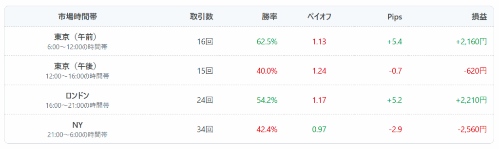 初期設定は 東京: 6~16時 / 欧州: 16~21時 / NY: 21~6時 になっています。これを例えば画像のように東京の午前・午後で分けたり、NYロンフィク前後に分けたり、特定の時間帯だけを絞って設定することで、その時間帯のパフォーマンスが表示されます。
