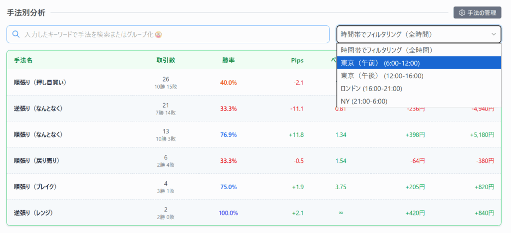 手法分析では、設定した時間帯で結果をフィルタリングすることが出来ます。