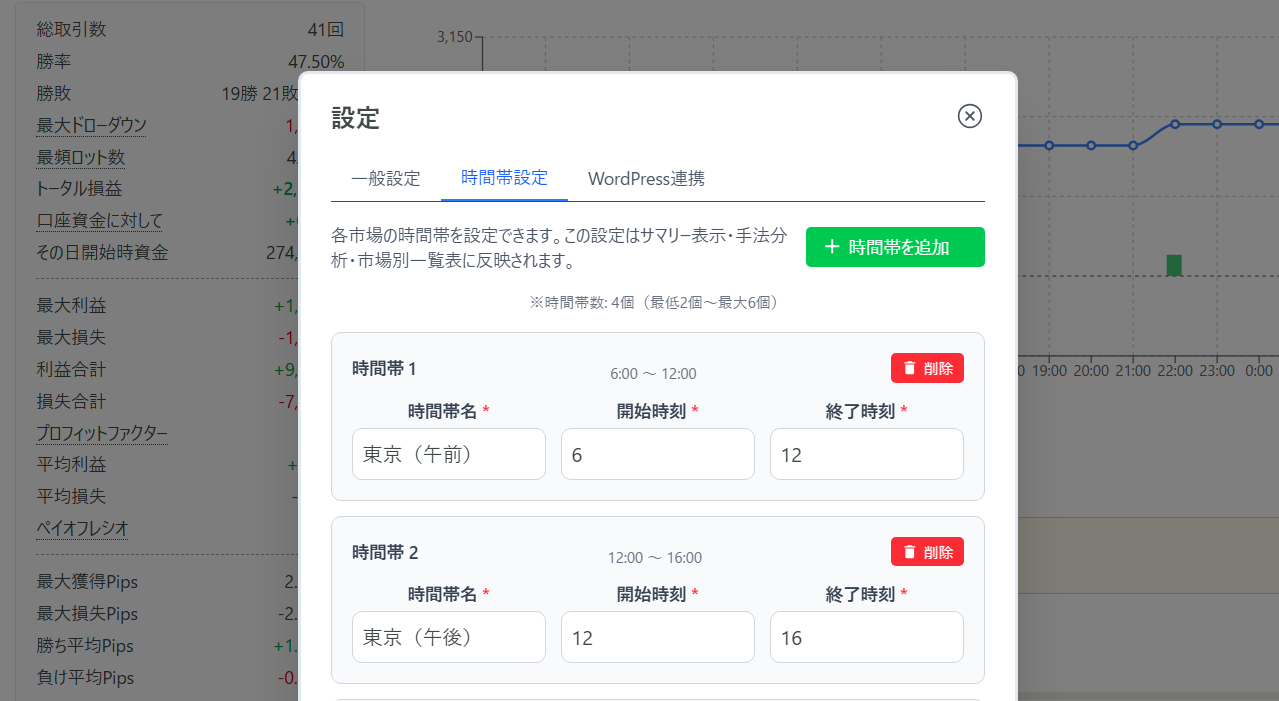 初期設定は 東京: 6~16時 / 欧州: 16~21時 / NY: 21~6時 になっています。これを例えば画像のように東京の午前・午後で分けたり、NYロンフィク前後に分けたり、特定の時間帯だけを絞って設定することで、その時間帯のパフォーマンスが表示されます。